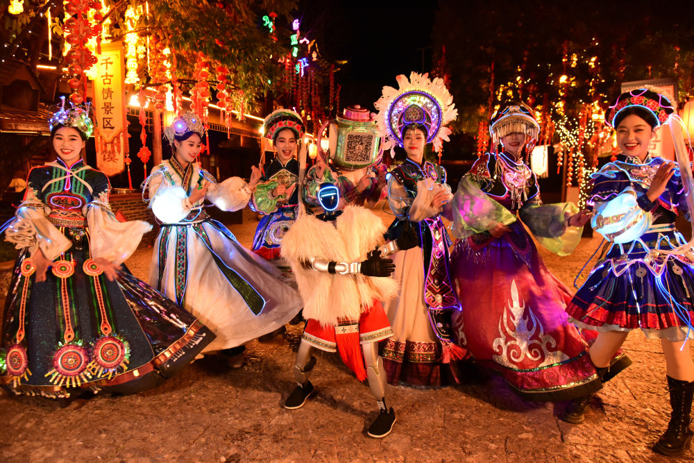 除了傳統(tǒng)非遺的展示,麗江千古情景區(qū)還融入了智慧科技元素。機器人穿上納西服飾,與游客親切互動、共舞同樂,成為貫穿外景動線的科技亮點,為傳統(tǒng)年味注入了現(xiàn)代活力。此外,“新春火舞盛宴”更是匯聚了各種火秀奇觀,火魔方、火刀、火壺等表演讓游客們目眩神迷,驚嘆不已。